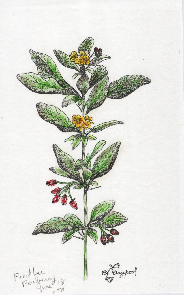 Fendler Barberry is a shrub that grows to eight feet tall. The edible berries have a flavor similar to tart cherries. Native Americans ate the berries raw and the stems were used for arrow making and basketry. The bright yellow flowers grow in clusters blooming in late spring. It was used to treat fevers and gum infections.