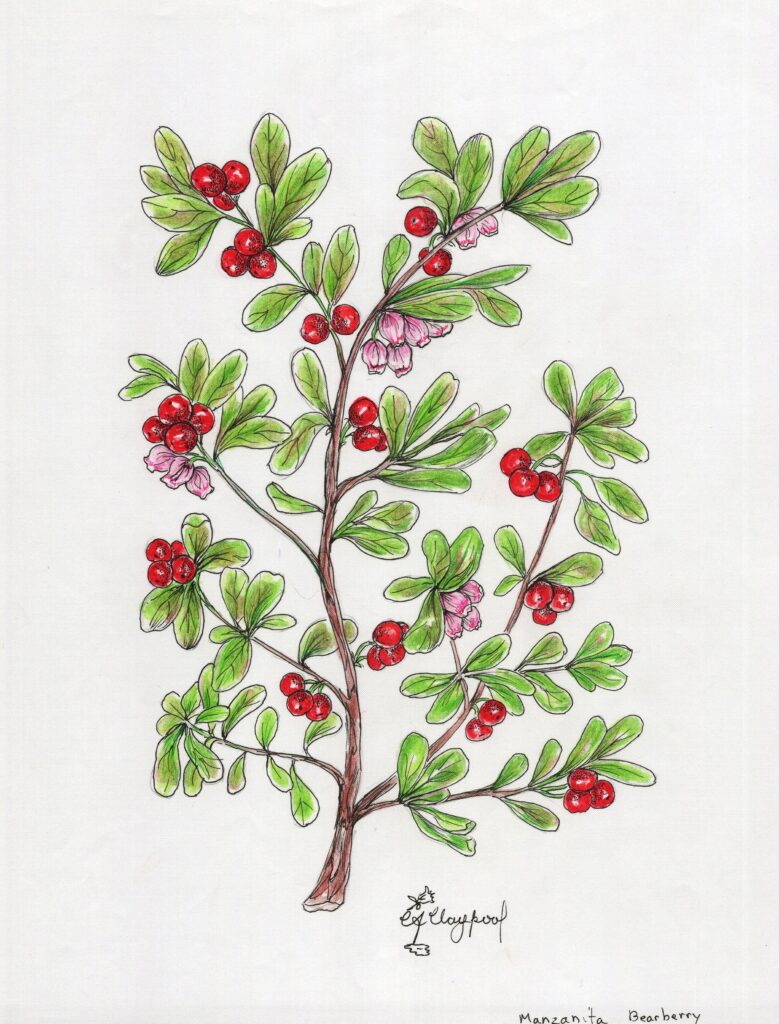 This mallow is a striking edible plant with deep red clustered flowers and narrow hairy leaves. Flowers have five petals and five sepals and grow up to sixteen inches in height. This plant is abundant in the southwest, growing in dry conditions on sandy soils and dry grasslands. Native Americans used the ground up plant as a poultice for wounds and burns, and the leaves have medicinal use as well. The whole plant was used as a food source and would also have been a grazing forage for domestic livestock.20. Manzanita/Bearberry (Arctostaphylos Uva-ursi) Heather Family KinniKinnik
