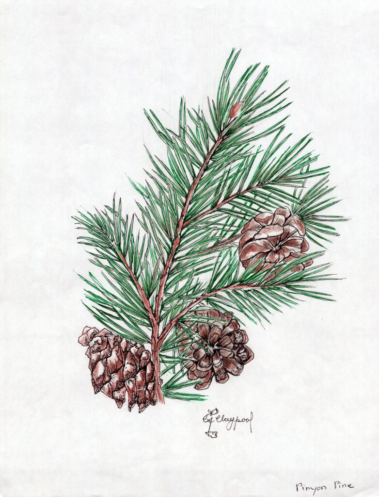 Deciduous tree found from 4000 to 8500 feet, usually on dry hillsides, slopes, canyons and mesas. It can grow to fifty feet tall and provided shelter, food and firewood. It was grazed upon by both wildlife and livestock. Acorns were used as a food source, leached in water to remove the tannic acid and ground into a meal for use as a porridge. Native Americans may have used the tannins as dyes or astringent for sore throats.23. Pinyon Pine (Pinus edulis) Pine Family
