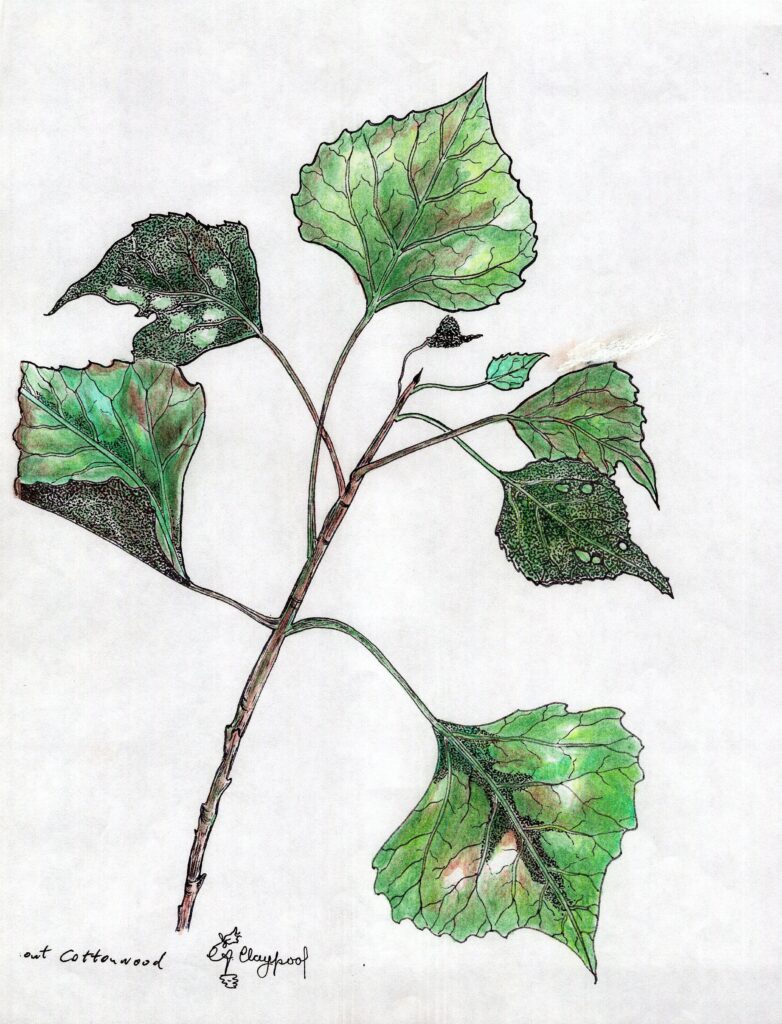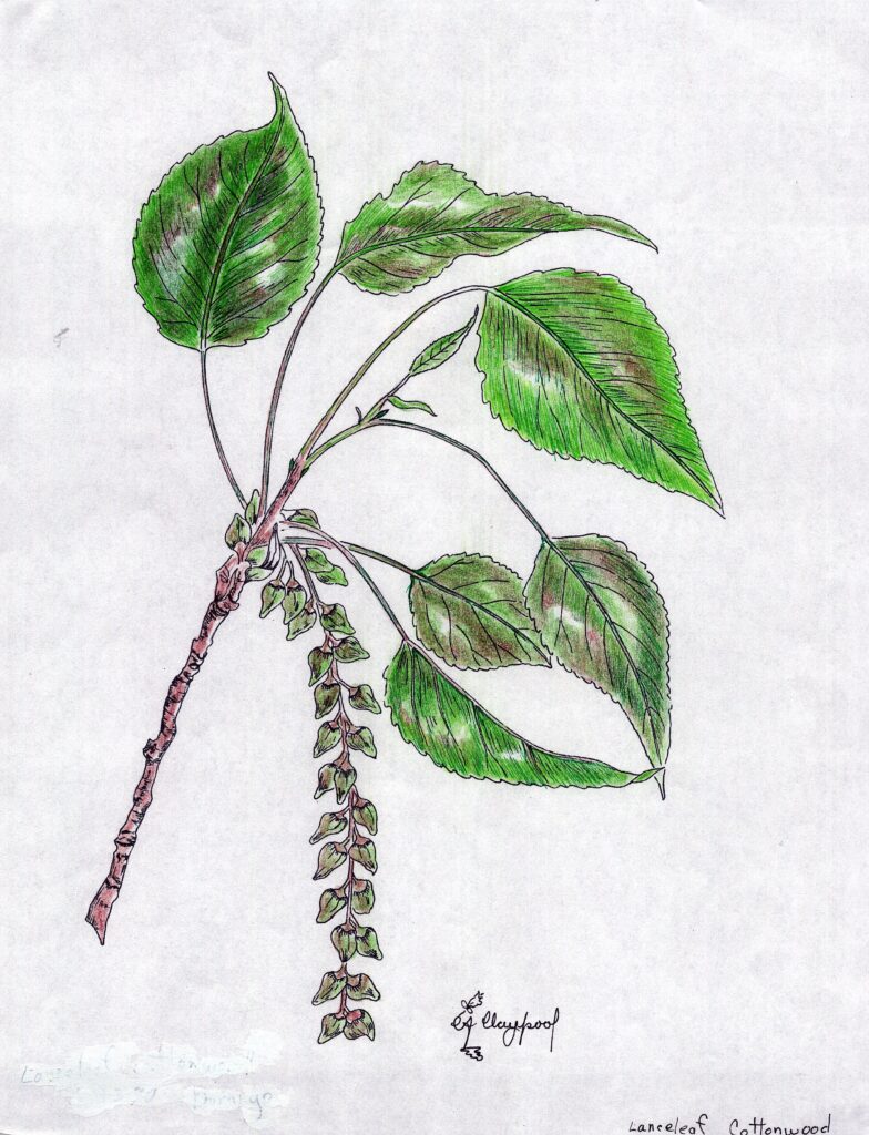 All cottonwoods bear both male and female flowers on separate trees. Mature seeds from the female catkins are covered with white fuzzy cotton from which then named cottonwood is derived. It usually grows between fifty to sixty feet tall but can grow as tall as ninety feet. The sap is sweet and edible either raw or cooked. Leaves and bark can be used for herbal teas, and the root wood was used by the Hopis for carving Kachina dolls. The Ute tribes held councils under the shade of large cottonwoods. The leaf buds contained anti-inflammatory salicylates used to reduce fevers. Fremont cottonwood requires riparian habitat and must have its roots in the water table.26. Lanceleaf Cottonwood (Populus acuminata) Willow Family