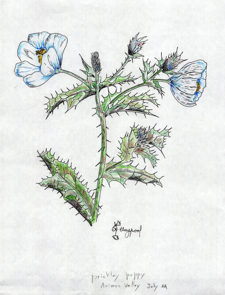 This tree he can grow up to fifty feet tall with a diameter up to two feet. It is a fast-growing tree that can grow six feet in a year and have a life span of over 100 years. The leaves are long and slender and the seeds are attached to hair like follicles which look similar to a cotton ball and thus derived the name of cottonwood. Bark and leaves were used by Native Americans to treat wounds and provide firewood. The cotton-like seeds were used to stuff pads and pillows and the inner bark was used to make soap. The leaves are edible for humans as well as livestock.27. Prickly Poppy (Argemone pleiacantha) Poppy Family