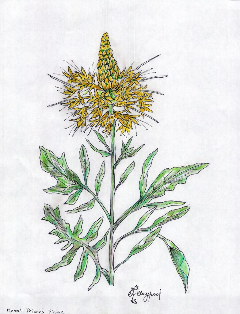 Prickly Poppy is found throughout the southwest in disturbed areas and somewhat resembles a thistle. Flowers are large with white petals and yellow centers and bloom from late spring to autumn. The entire plant, although thorny, was used medicinally as a tea to reduce pain and as a sedative. Native Americans used the dried plant as an alternative to tobacco. This slightly toxic plant would be used topically but not as food for either humans or cattle.28. Desert Prince’s Plume (Stanleya pinnata) Mustard Family