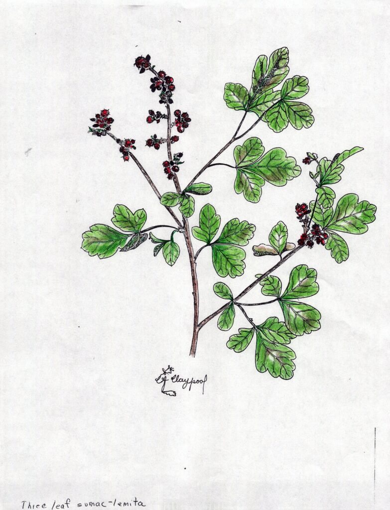 This is a drought resistant shrub that grows from six to fifteen feet high, common in canyons and arid parts of foothills. It has clusters of white blossoms and purple hued blueberry like fruits which are sweet and edible. Native Americans used the berries as a food source either fresh or mixed with buffalo and venison meat and fat to make and store as pemmican. The berries were also eaten by numerous forms of wildlife and could have been a forage for livestock.31. Three leaf sumac or Lemita (Rhus trilobata) Sumac Family