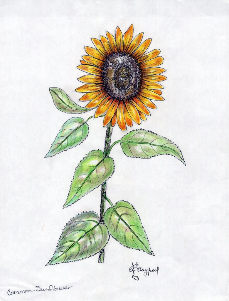 This shrub has various common names including skunk bush, sumac and Sour berry. It grows from two to six feet tall on dry hillsides, canyons, plains, deserts and valleys. The flowers are tiny yellow and in summer will develop into edible but very sour bunches of small sticky red berries with a flavor similar to lemon. Native Americans dried the berries to make pemmican and used the stripped bark for basket making. The berries were also used as a lemonade-like beverage.32. Common Sunflower (Helianthus annus) Daisy Family