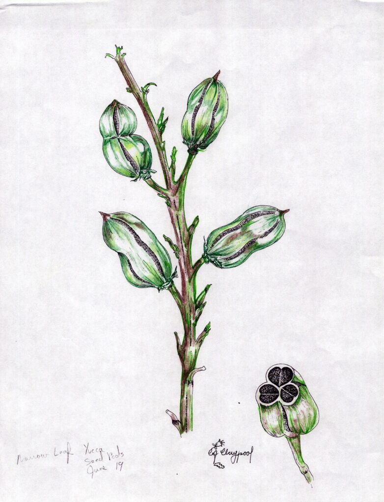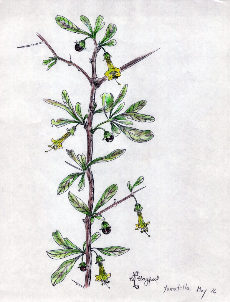 Tomatillo or little tomato is a spiny shrub that can grow to six feet but average is closer to three feet. It has pale greenish gray leaves and small yellow green trumpet-like blossoms. Fruits are marble size and edible, but bitter and even in times of shortage is either fresh or dried. The fruits were eaten by birds and animals and are still used today to make salsa and sauces.34a. Narrow Leaf Yucca (Yucca angustissima) Agavaceae Family