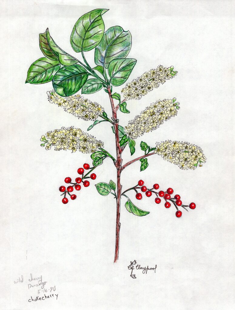 The Quaking Aspen deciduous tree can grow from 50 to 80 feet tall and has bright green three-inch-long sawtooth edged leaves that turn a golden yellow in autumn. The tree usually grows in thick groves which are easily identified by its cream color, pale gray-green bark. Quaking Aspen gets its name from the fluttering or trembling motion the leaves make in the breeze. It is native to north America and can usually be found at elevations from 5,000 to 10,000 feet. It is the state tree of Utah. The bark is eaten by moose, elk, deer and beavers who also use it to build dams. The shoots serve as forage for cattle, sheep and goats. Native Americans used the bark as a medicine similar to quinine and also used the inner bark, catkins, sap and seeds for food sources and medicinal properties. The bark contains salicylic acid, a source of natural aspirin, and used as a remedy to treat pain. The wood was used by the Ute tribes in the making of teepees, shelters and lodge construction. The Utes also carved glyphs representing significant events onto the bark and considered the Aspen as a medicine tree and one of their sacred trees.36. Chokecherry/Wild Cherry (Prunus virginiana) Rose Family Rosaceae