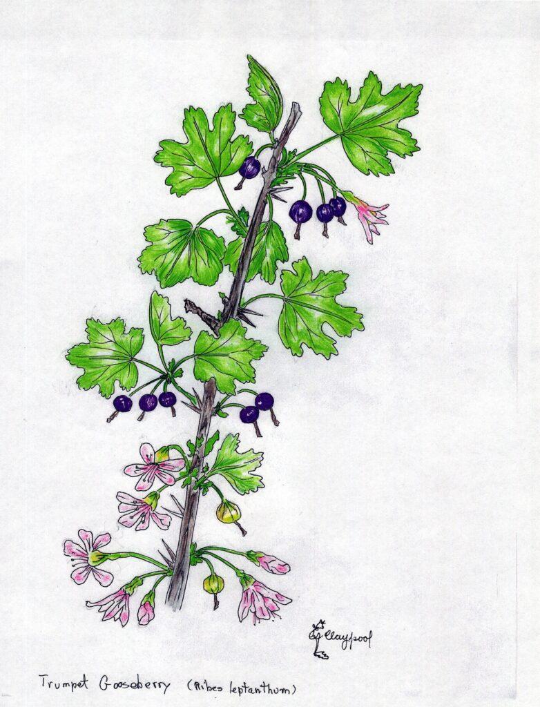 Chokecherry is native to North America and grows from ten to fifteen feet tall along stream and riverbanks, forests, woodlands, rocky slopes and roadsides. It can be found in elevations from 4,500 to 9,000 feet. The name was derived from the sourness of the fruit maybe causing people to choke if not prepared for the taste. The blossoms are whitish in color with five petals and bloom in May. The leaves are two to four inches long and the dark red to purple fruits have a long list of uses including wine, jellies, syrup and pie making. Native Americans used the fruits for food pemmican and as a medicine for stomach ailments. Tart cherry is popular today as a treatment for arthritis and anti-inflammatory. Chokecherry made an excellent flavor for cough syrup, wine and antioxidant as they are loaded with Vitamin C. The bark and pits contain a substance that releases cyanide when crushed so would have been avoided. The inner bark was made into a tea to treat diarrhea and respiratory illness. Extracts of the inner bark was used as an astringent to be applied topically to wounds and abscesses. The fruits also served as food for wildlife especially loved by bears.37. Trumpet Gooseberry (Ribes leptanthum) Currant Family