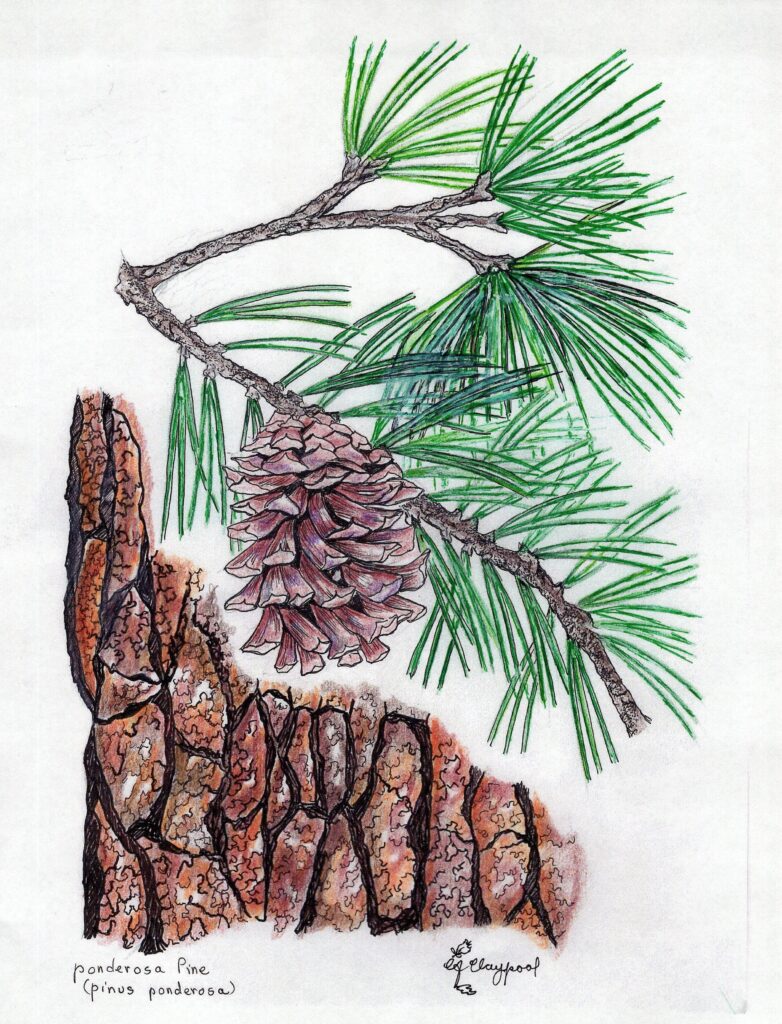 Trumpet gooseberry, in the same genus as currant, is native to the southwest. It can be distinguished from the currant by its larger berries and often has thorns on the stems, while currants do not. It grows in sunny dry areas at elevations from 5,500 to 12,000 feet, usually about three feet tall but can reach as tall as six feet. The white to pinkish blossoms have five petals and the berries are dark purple to black when ripe. The berries have a sour taste when green but turn sweeter when ripe and are edible by wildlife and humans. Both birds and bears find them appealing as forage, and they are a good source of vitamin C, vitamin A, potassium and manganese. Native Americans used the berries to make pemmican, jams, jellies and tea. The leaves and flowers were made into poultices for skin infections and the Navajos used the woody stems to make arrow shafts. The roots were used for cordage.38. Ponderosa Pine (Pinus Ponderosa) Pine Family Pinaceae