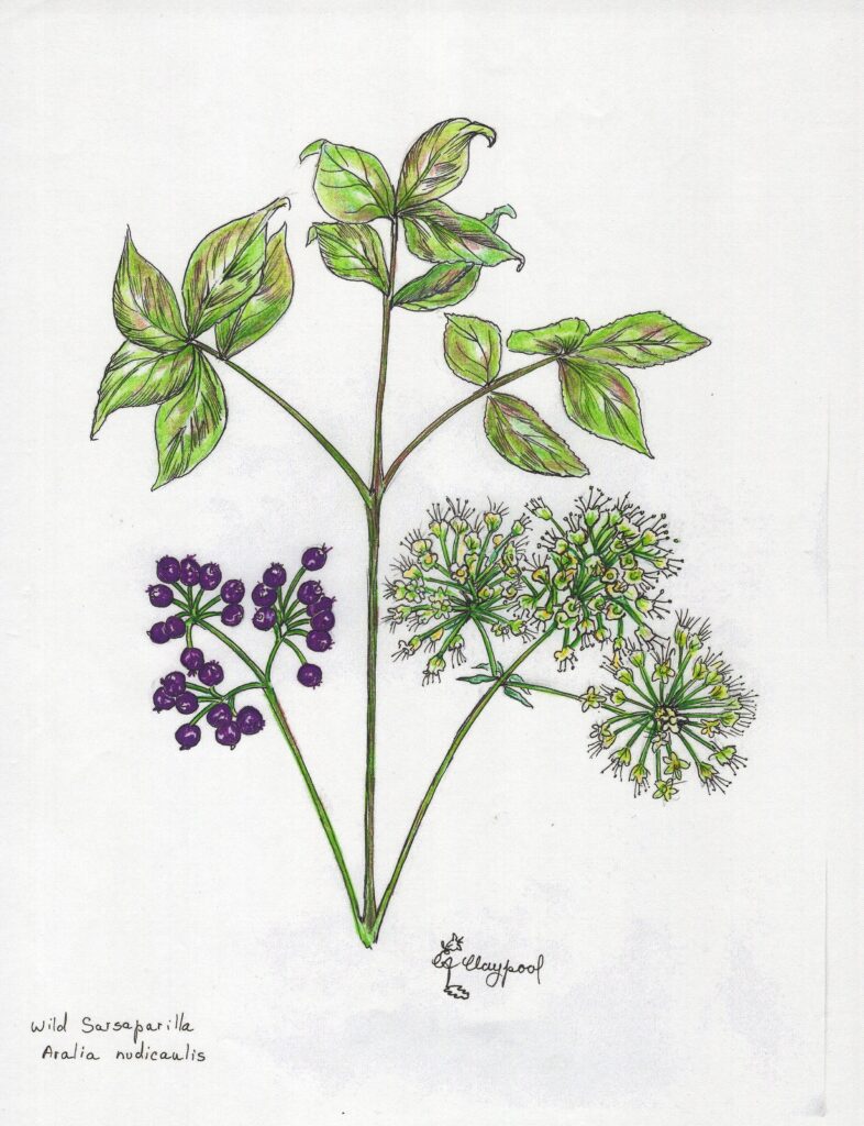 Wild Sarsaparilla is native to North America and associated with the popular soda, Root Beer. It grows in sunny, dry or moist climates in elevations anywhere from 5500 to 12,000 feet. It is also found in shady Colorado woodlands in rich soil. It can reach five to sixteen inches tall with one eighth inch wide flowers divided into three groups of five toothed leaflets. The flower clusters are a cream white color and the fruits, originally green, turn to reddish green and when mature, a deep dark purple. They have a sweet mild flavor and were used by Native Americans to make jellies, pemmican and beverages. The plant grows on a stalk with three branches of leaves. The roots, berries and young shoots are edible and traditionally the rhizomes were used for making root beer. Native Americans used the plants as food and medicine, including the young cooked roots. A tea made from the rhizomes served as a remedy for toothaches, sore throats, cardiac and stomach problems.
