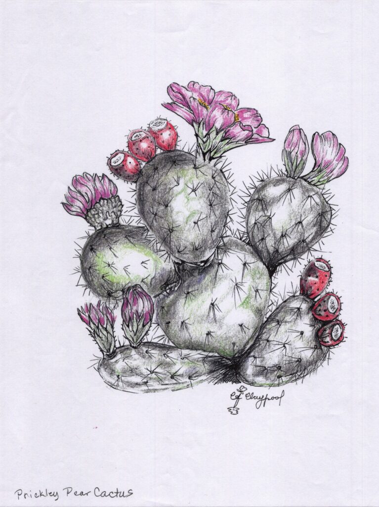 There are many species of prickly pear cactus commonly found throughout the southwest in deserts, dry mountain slopes and grasslands. They spread out flat, spiny pads that are typically two to three inches wide and four to twelve inches tall and the blossoms can be any color but mostly reddish to yellow. The succulent fruits, blossoms and pads are edible and served as a food staple to Native Americans.