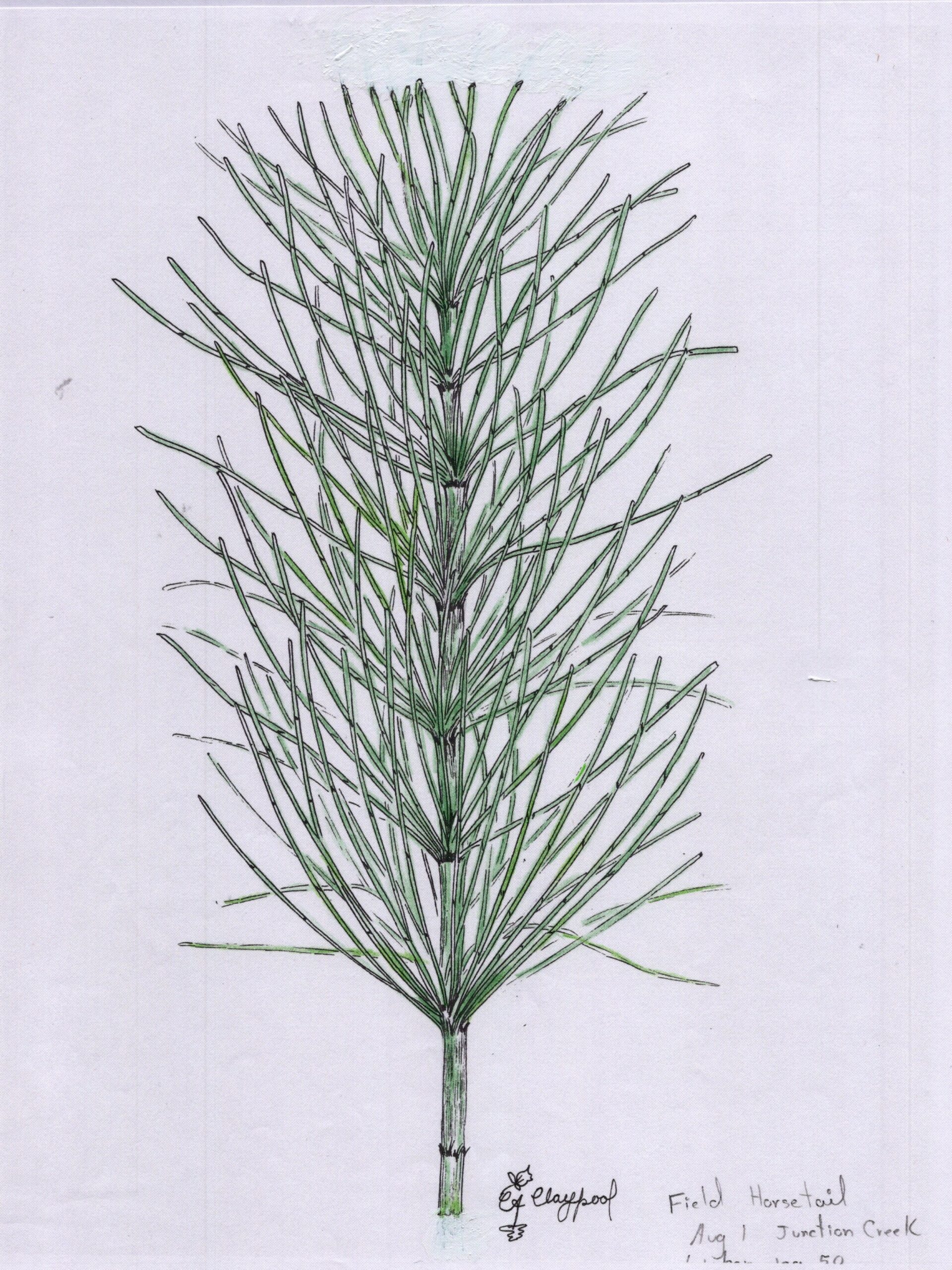 River Hawthorn can be identified by its small whitish blossoms, one-inch-long blackish curved thorns, and red to black small apple like fruits. The berries were dried, eaten or made into pemmican, but the seeds contained cyanide and are not edible. The whole plant is medicinal and often used for cardiac conditions. Native Americans also used the berries as a coffee-like beverage and the leaves were used as an alternative to tobacco. River Hawthorn can be found along the western slopes stream in the southwest.15. Field Horsetail (equisetum arvense)