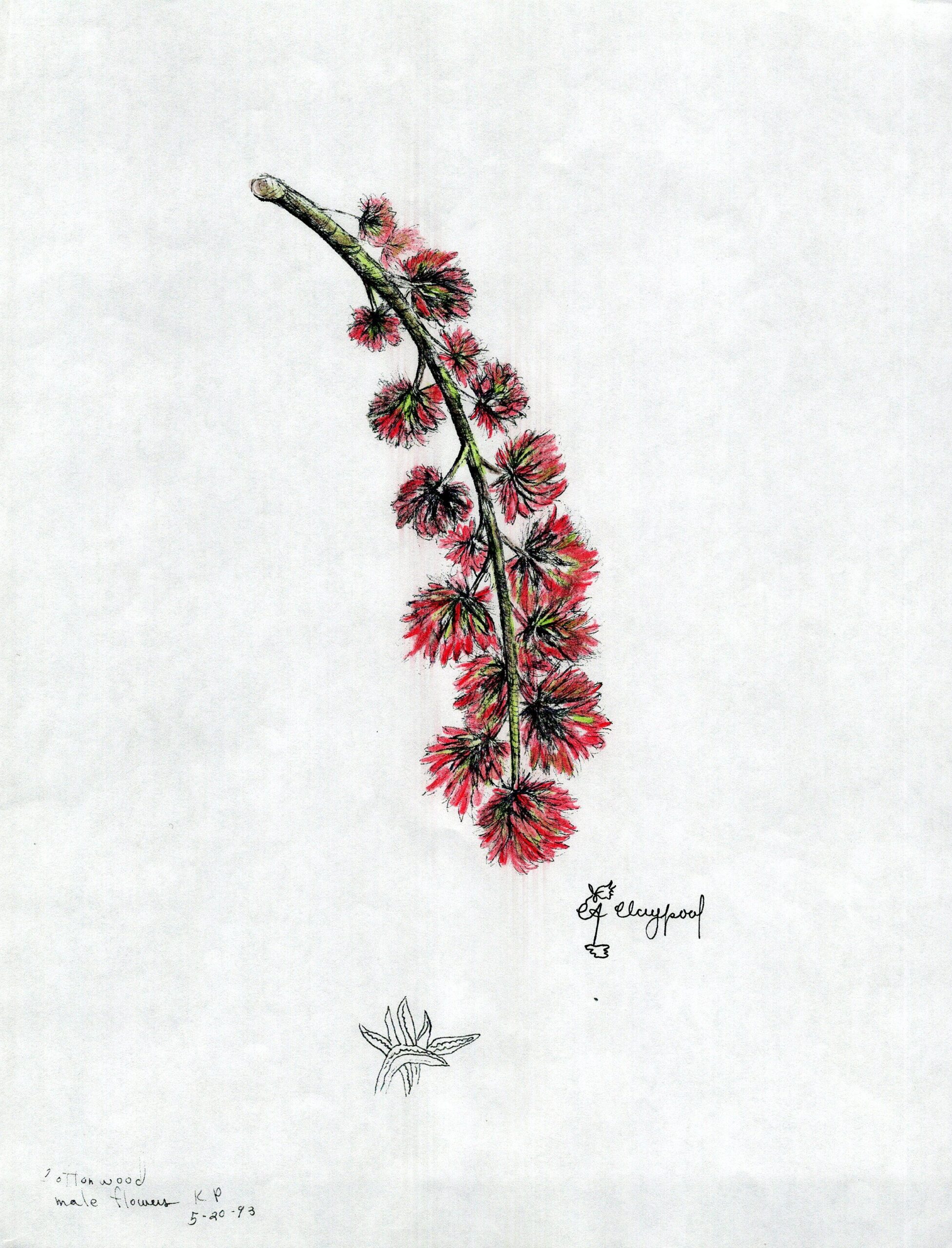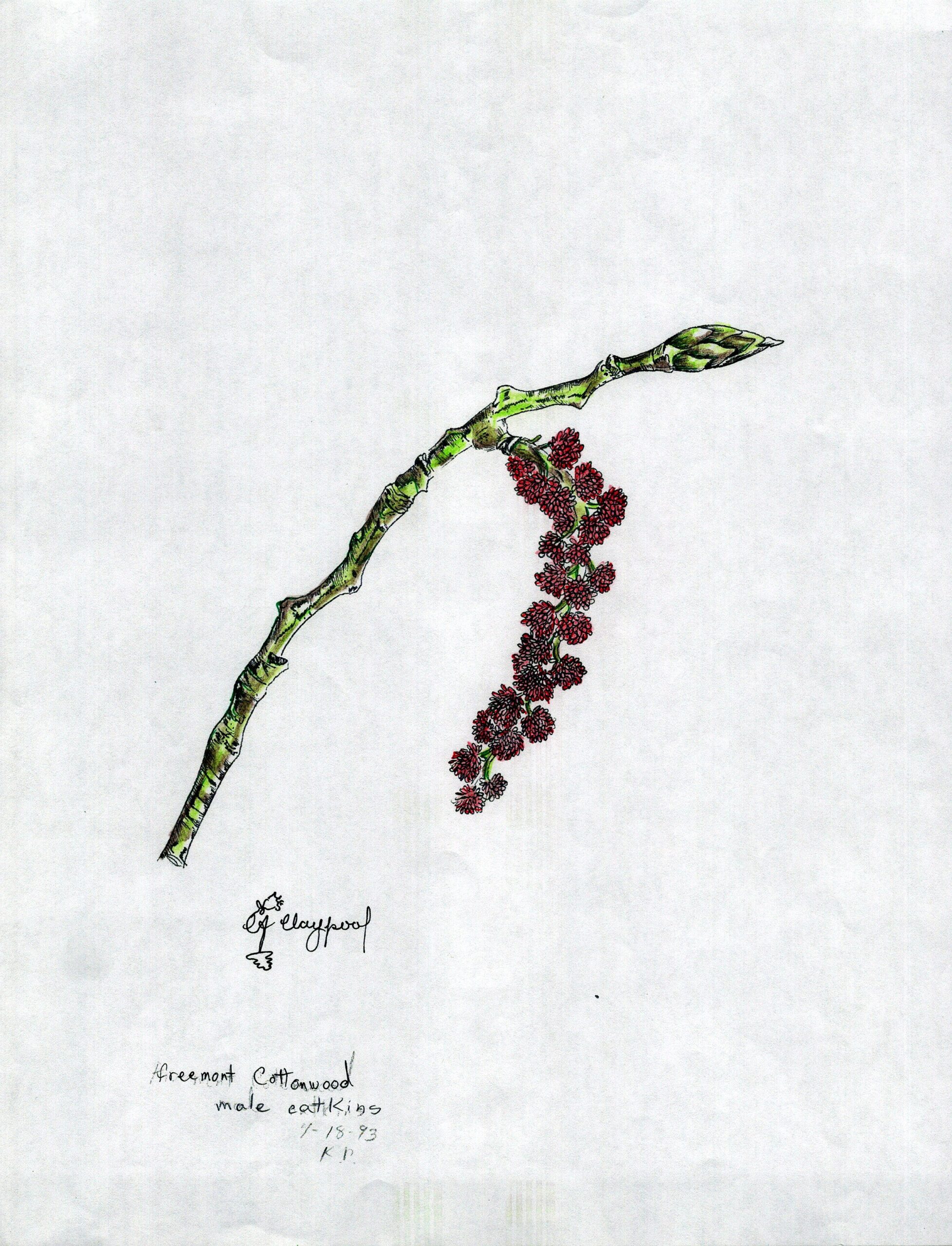 All cottonwoods bear both male and female flowers on separate trees. Mature seeds from the female catkins are covered with white fuzzy cotton from which then named cottonwood is derived. It usually grows between fifty to sixty feet tall but can grow as tall as ninety feet. The sap is sweet and edible either raw or cooked. Leaves and bark can be used for herbal teas, and the root wood was used by the Hopis for carving Kachina dolls. The Ute tribes held councils under the shade of large cottonwoods. The leaf buds contained anti-inflammatory salicylates used to reduce fevers. Fremont cottonwood requires riparian habitat and must have its roots in the water table.26. Lanceleaf Cottonwood (Populus acuminata) Willow Family