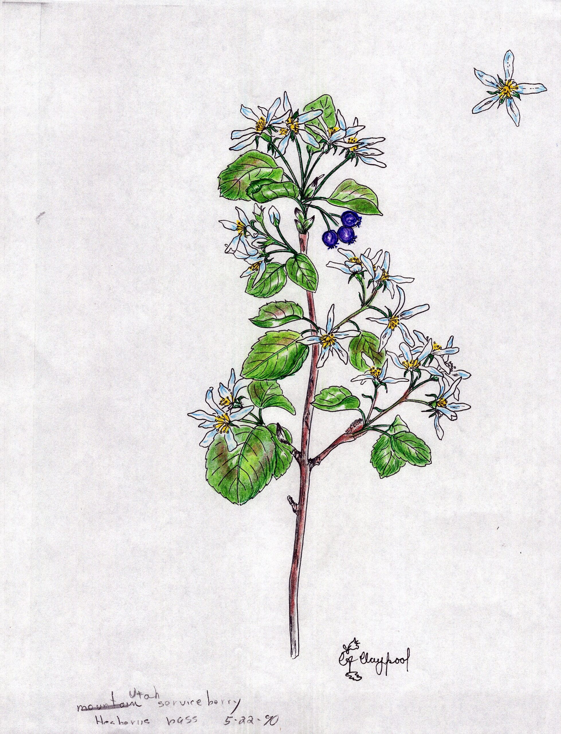 Sagebrush is extremely abundant in all of the southwest and grows between two and seven feet tall. Its habitat is the high deserts or plains and has silvery green hairy leaves, which are wedge shaped and highly aromatic. Because of its highly fragrant appeal, sagebrush was dried, bundled and used to make smudge sticks for ceremonies and used like incense. The smoke from the lit bundle was a means to purify oneself before sacred ceremonies. Sagebrush was used medicinally and also as campfire fuel. Cattle and sheep are able to browse on sagebrush as a food source when feed is scarce.30. Utah Serviceberry (Amelanchier Utahensis) Rose Family