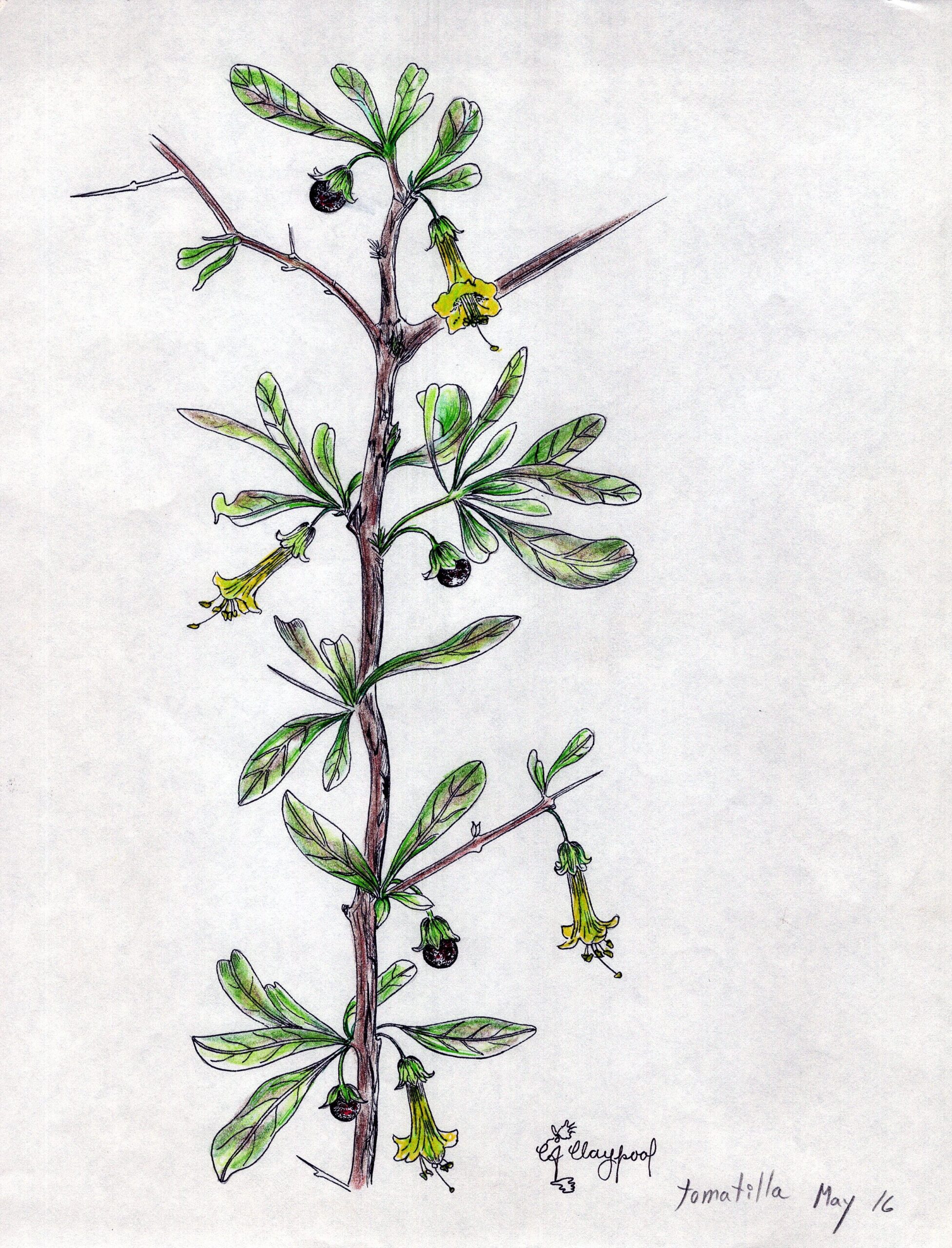 Sunflowers are common, easily recognizable, and can grow more than ten feet tall. They require six to eight hours of sunlight a day in order to thrive. The entire flower is edible. The plant has broad serrated edged leaves, a coarse fuzzy stem and the flower head has yellow petals and a dark round center disc made up of many small flowers. Native Americans and non-Natives made use of the entire plant. The seeds are edible, raw, cooked, or pounded into flower for bread. The seed oil is used even today. The plant is medicinal and also used for dyes, ceremonies and building materials. Today this plant is a popular ornamental as well as providing a healthy snack.33. Tomatillo or Pale Wolfberry (Lycium palliclum) Night Shade Family