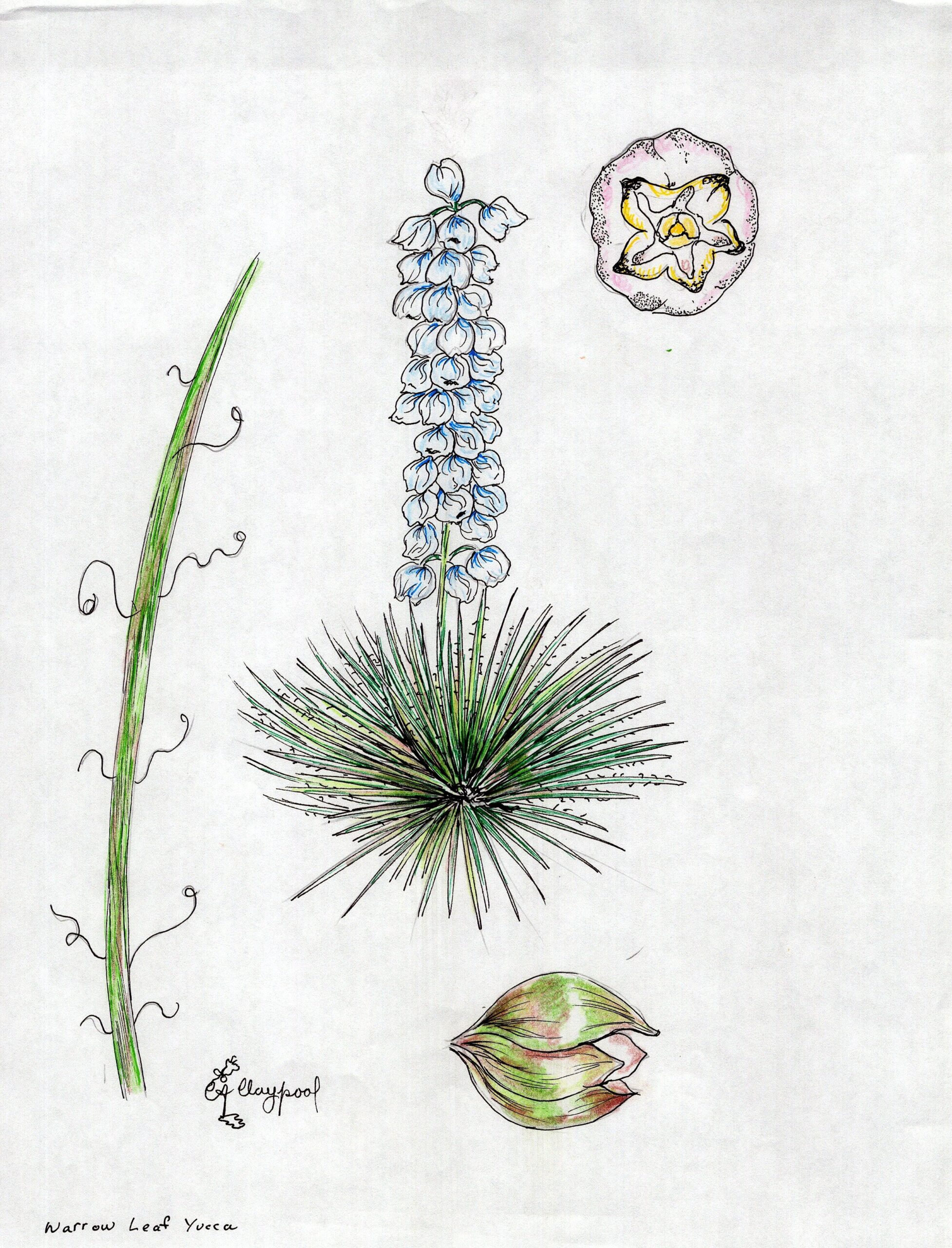 Tomatillo or little tomato is a spiny shrub that can grow to six feet but average is closer to three feet. It has pale greenish gray leaves and small yellow green trumpet-like blossoms. Fruits are marble size and edible, but bitter and even in times of shortage is either fresh or dried. The fruits were eaten by birds and animals and are still used today to make salsa and sauces.34a. Narrow Leaf Yucca (Yucca angustissima) Agavaceae Family